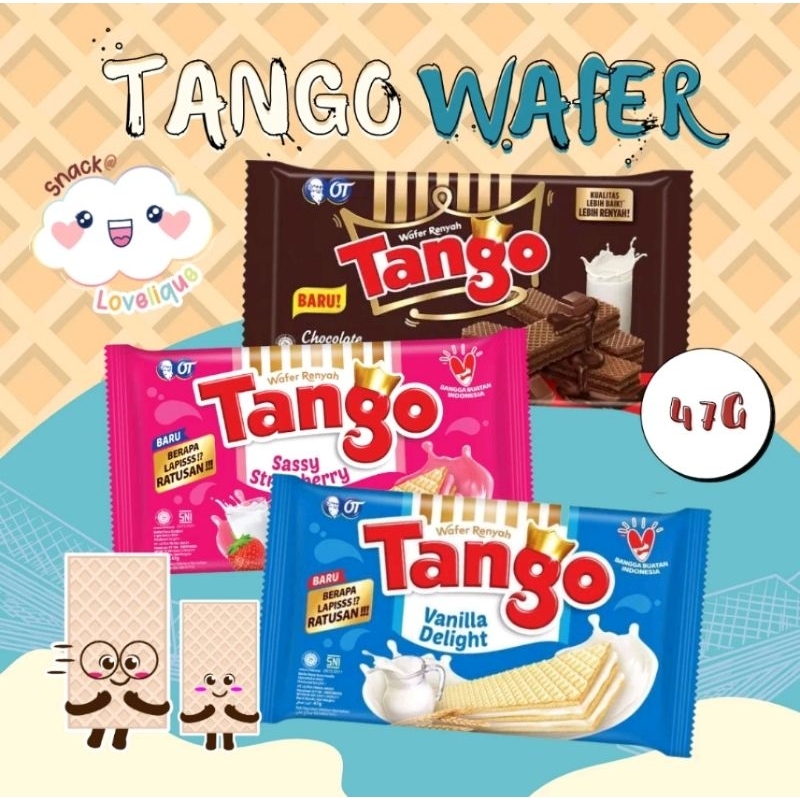 Tango Wafer merupakan camilan wafer renyah yang terbuat dari bahan-bahan berkualitas. Dengan rasa krim yang manis dan tekstur wafer yang renyah, cocok sebagai camilan teman minum kopi dan teh. Tersedia dalam berbagai varian rasa.