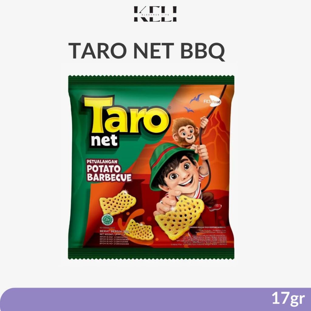 Taro Net, makanan ringan berbentuk seperti jaring. Bernetto 17 gram. Ber BPOM dan Halal MUI.