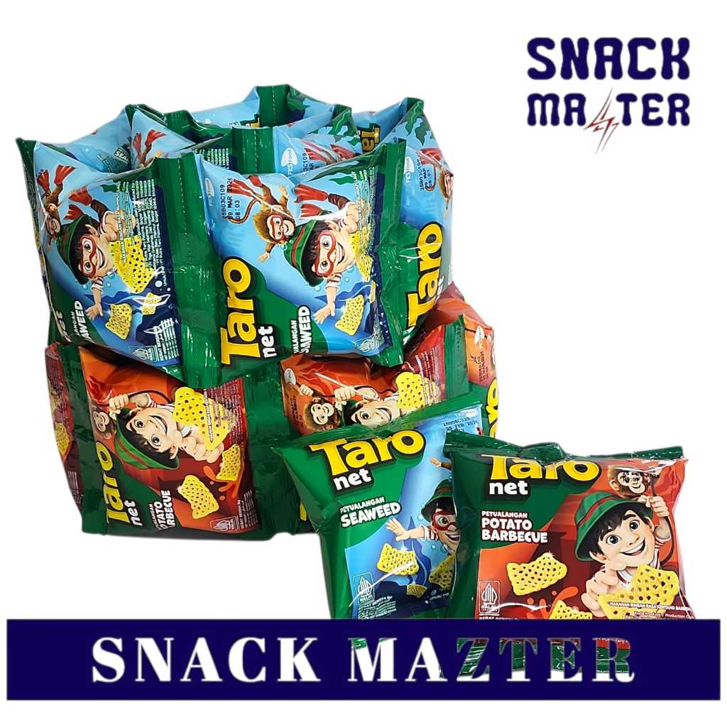 Taro Net, makanan ringan berbentuk seperti jaring. Bernetto 9 gram. Ber BPOM dan Halal MUI. dijual per renceng isi 10 bks