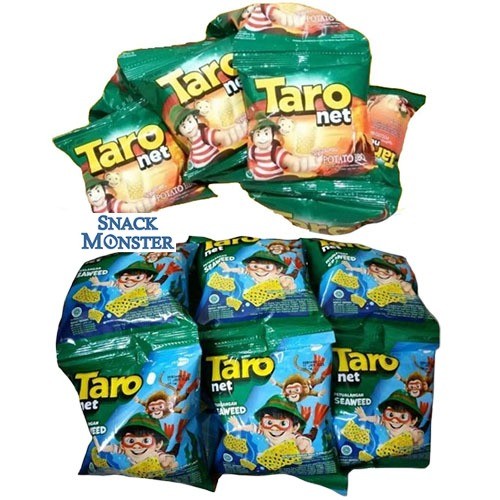 Taro Net, makanan ringan berbentuk seperti jaring. Bernetto 9 gram. Ber BPOM dan Halal MUI. dijual per renceng isi 10 bks