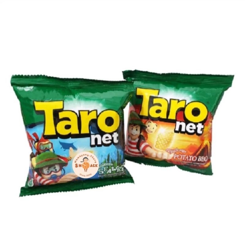 Taro Net, makanan ringan berbentuk seperti jaring. Bernetto 9 gram. Ber BPOM dan Halal MUI. dijual per renceng isi 10 bks