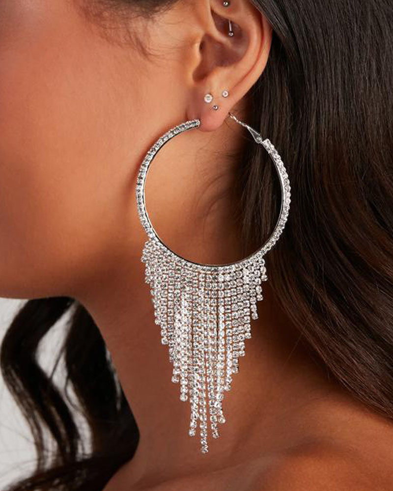 Tassel Design Rhinestone Hoop Earrings, Silver