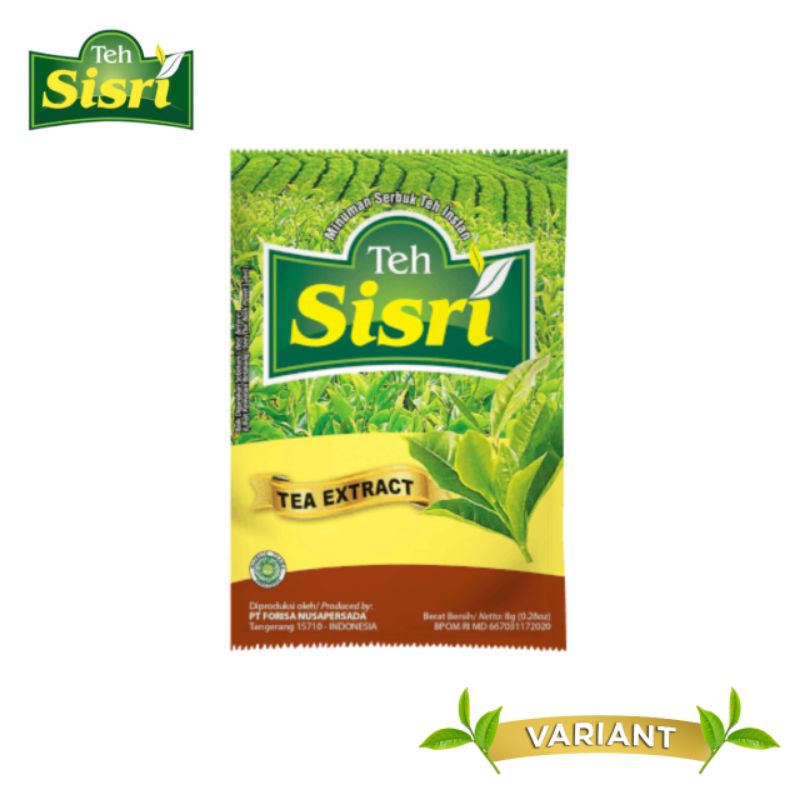Teh Sisri Dari Forisa merupakan salah satu produk teh dalam bentuk bubuk instan yang praktis. Teh Sisri sudah dilengkapi dengan gula, sehingga tidak membutuhkan penambahan gula. Minuman ini menyegarkan, juga memiliki aroma yang khas. Produk ini terbuat dari bahan alami yang berkualitas. Dijual 1pcs bernetto 8 gr per bungkusnya. Ber BPOM Dan Halal MUI.