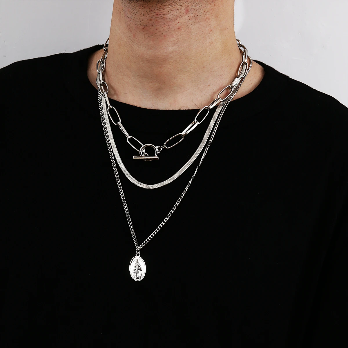 SHIXIN 3 Layer Necklace Mens Flat Snake Chain Jesus Pendant Portrait Necklace Circle Lariat Necklaces for Mens Couople Jewelry, Silver