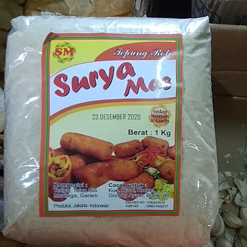 Tepung Roti Surya Mas 1kg sangat berkualitas cocok untuk kue, risol, kroket, ayam goreng, bistik, dll.