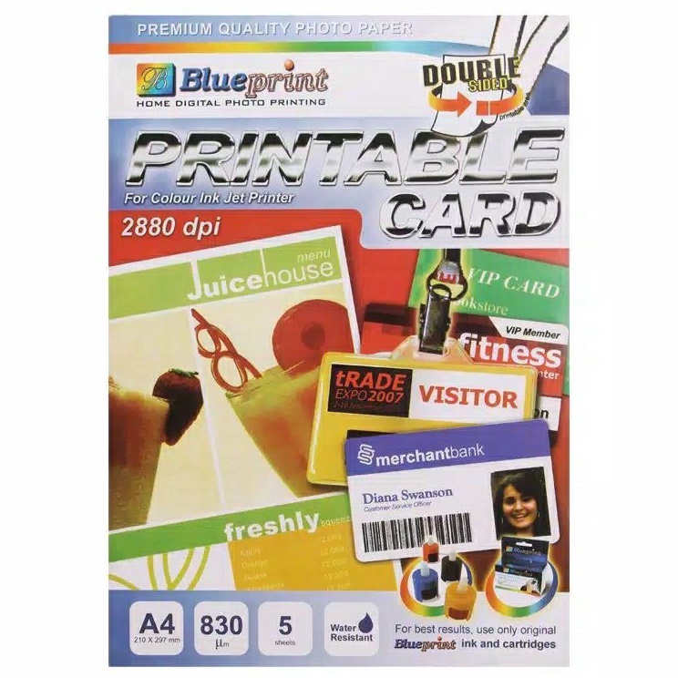 Blueprint PVC ID Card ideal digunakan untuk mencetak kartu identitas, kartu member, menu restoran dan kartu plastik lainnya. Kertas PVC id card ini dicetak dengan menggunakan semua jenis printer inkjet.