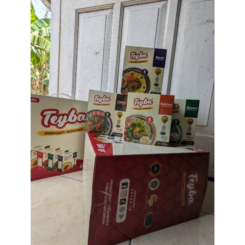 Paket bumbu nasi kebuli Teyba merupakan paket siap pakai yang berisi beras basmati, bumbu bubuk, dan bumbu rempah-rempah untuk memasak nasi kebuli ala Timur Tengah.