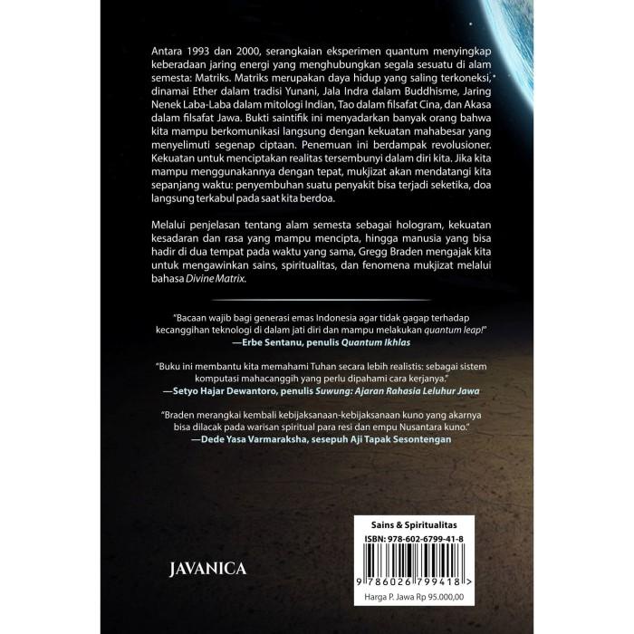 Melalui penjelasan tentang alam semesta sebagai hologram, kekuatan kesadaran dan rasa yang mampu mencipta, hingga manusia yang bisa hadir di dua tempat pada waktu yang sama, Gregg Braden mengajak kita untuk mengawinkan sains, spiritualitas, dan fenomena mukjizat melalui bahasa Divine Matrix.