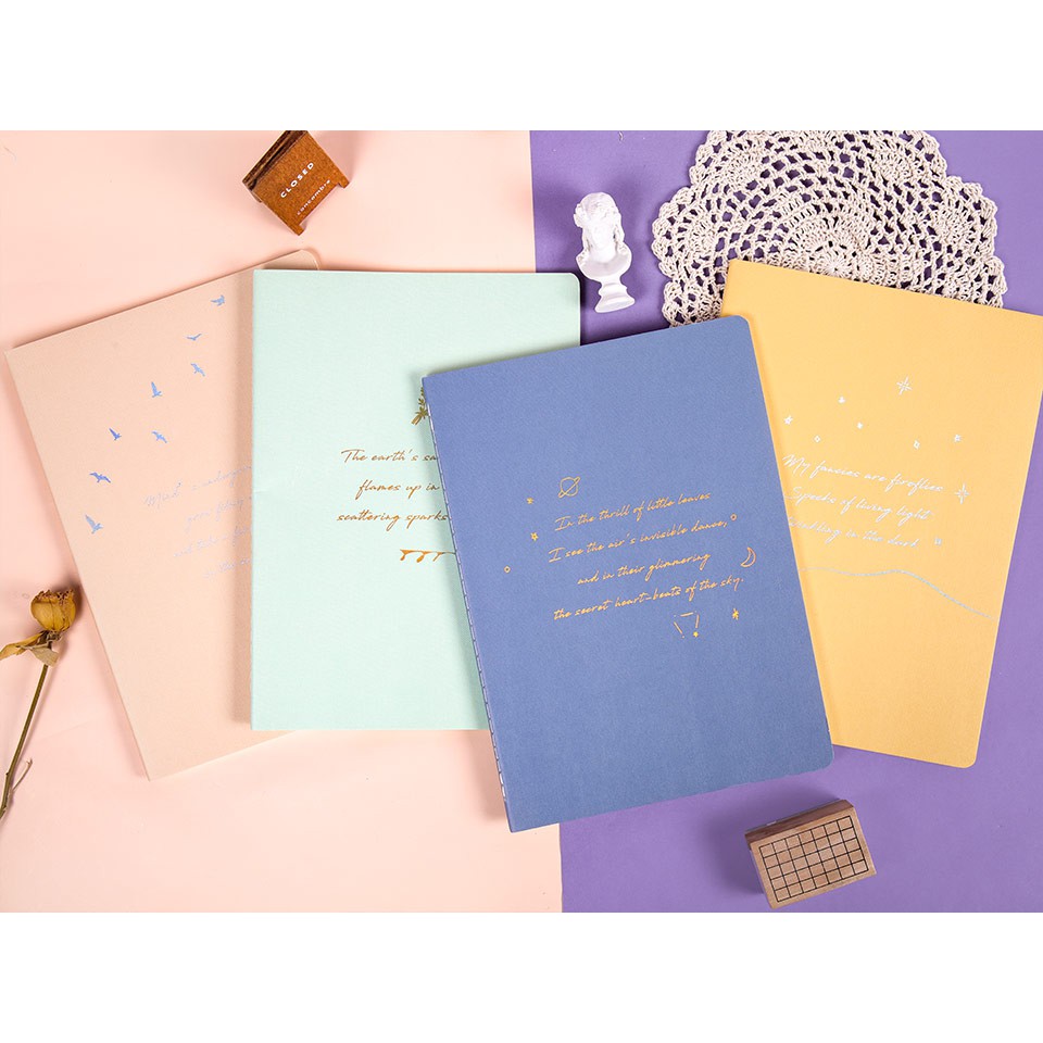Seri buku tulis The Fireflies Poem menghadirkan sampul berwarna polos yang dihiasi cetakan tinta emas atau silver berisi cuplikan puisi dan ilustrasi minimalis. Buku catatan bergaris ini bisa digunakan untuk berbagai kebutuhanmu di rumah, sekolah, maupun kantor. Dengan jilid jahitan benang, buku bisa dibuka lebar untuk ditulisi dan halamannya tidak mudah lepas.