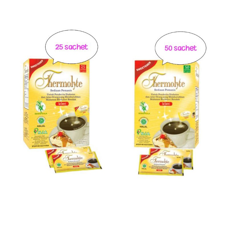 Thermolyte Sweetener / Thermolyte Diet Sugar mengandung sukralosa yang rasanya manis dan praktis digunakan sebagai pengganti gula untuk yang sedang program diet (program menurunkan berat badan) dan orang yang diabetes.