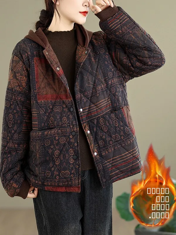 Thiened, хлопковое пальто большого размера, повседневное женское зимнее пальто с капюшоном и принтом в стиле ретро, удобная дышащая молния...