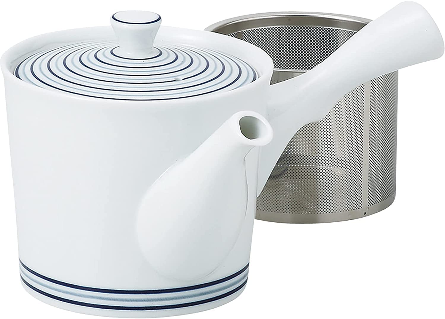 This lightweight teapot features a sleek white base with blue Its diameter is its capacity is and its comfortable handle makes it easy to It also