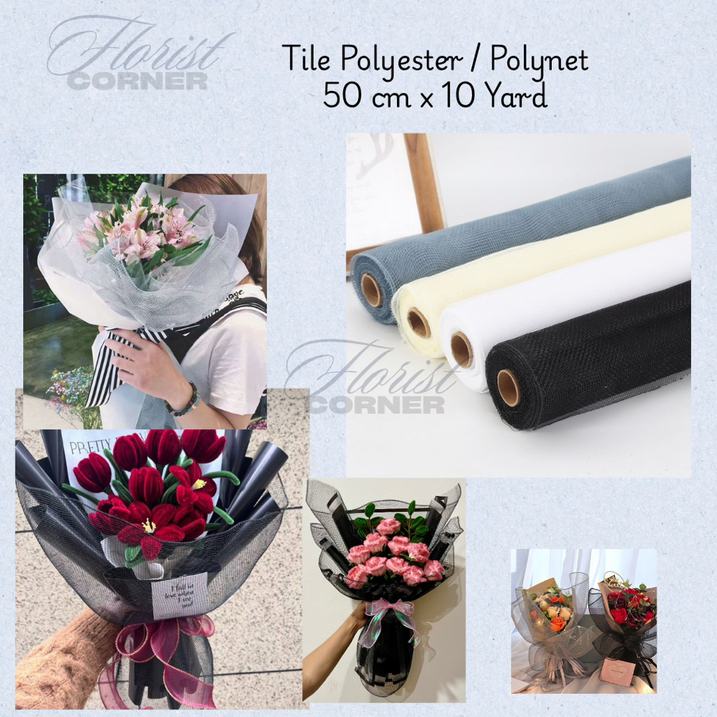 Tile polyester ini merupakan bahan dekorasi serbaguna yang sering digunakan untuk mempercantik rangkaian bunga, kemasan hadiah, maupun dekorasi acara. Dengan ukuran 50 cm x 10 yard, tile ini cukup panjang dan lebar untuk berbagai kebutuhan kreatif. Terbuat dari bahan polyester berkualitas tinggi, tile ini memiliki tekstur lembut, ringan, namun tetap kuat dan tidak mudah sobek. Sangat mudah dibentuk menjadi pita, hiasan, atau pembungkus buket bunga sehingga memberikan tampilan elegan dan menawan. Tile polyester ini juga cocok digunakan untuk dekorasi pesta, pernikahan, maupun kerajinan tangan lainnya. Dengan warna-warna menarik dan hasil akhir yang rapi, tile ini menjadi pilihan tepat untuk florist maupun dekorator yang ingin menghasilkan karya cantik dan profesional.