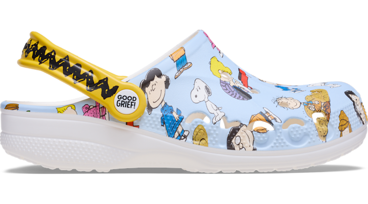 The gang’s all here … on the Peanuts Baya Clog. With an all-over print featuring everyone’s favorite characters, little ones can make their adventures more animated. Good grief, they’re cute. Toddlers' Peanuts Baya Clog Details: Allover Peanuts character graphics Customizable with Jibbitz™ charms Water-friendly and buoyant; weighs only ounces Easy to clean and quick to dry Pivoting heel straps for a more secure fit Iconic Crocs Comfort™: Lightweight. Flexible. 360-degree comfort.