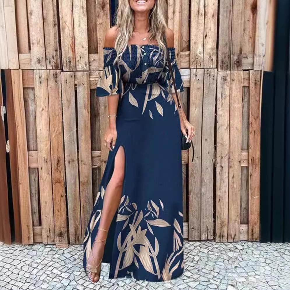 Tooxika Новое платье с разрезом и воротником одной линии, длинное платье с короткими рукавами и принтом на талии для женщин