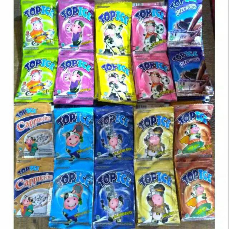 Top ice minuman serbuk aneka rasa isi 7 gram 1 renceng isi 10 sacheet Top Ice adalah minuman serbuk instant yang dapat disajikan dengan berbagai cara seperti dihidangkan bersama dengan ES, dan dihidangkan dengan hangat atau tanpa menggunakan ES.