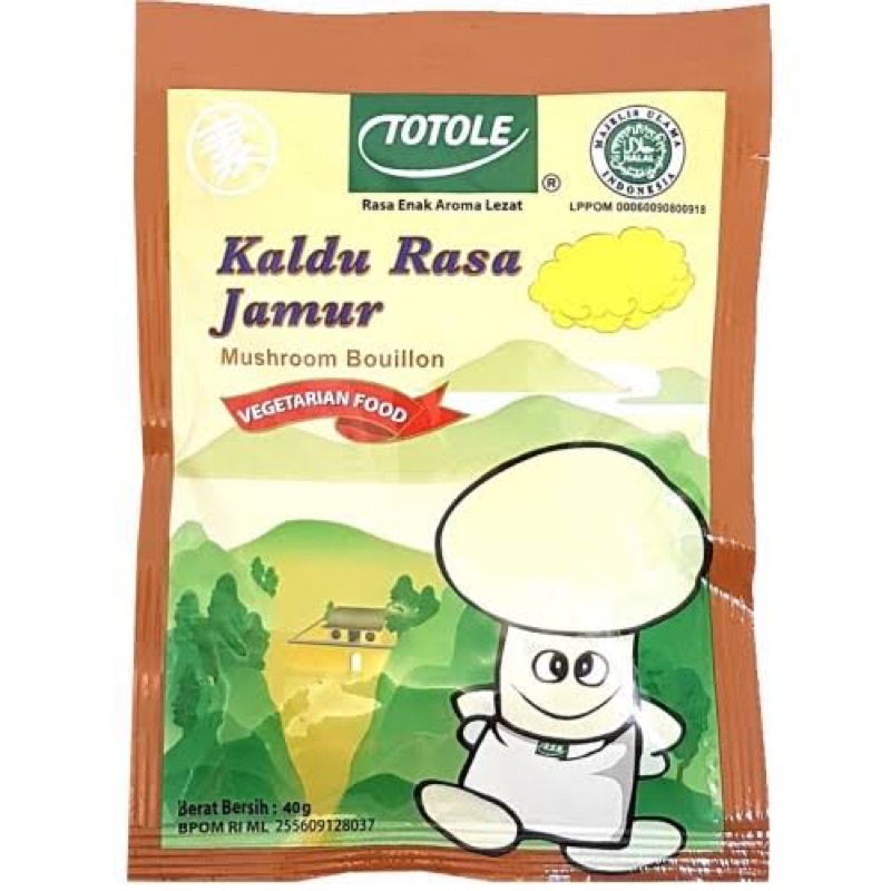 TOTOLE Bumbu Penyedap Kaldu Jamur 40GR (HALAL) Kaldu Kaldu Jamur TOTOLE berbahan baku jamur, sehingga sehat alami tanpa kandungan bahan kimia berbahaya bagi tubuh. Kaldu jamur TOTOLE berbentuk serbuk untuk membuat masakan anda menjadi lebih lezat dan sehat, sehingga aman untuk buah hati anda. Telah terbukti & disukai oleh ibu rumah tangga & para ahli masak.