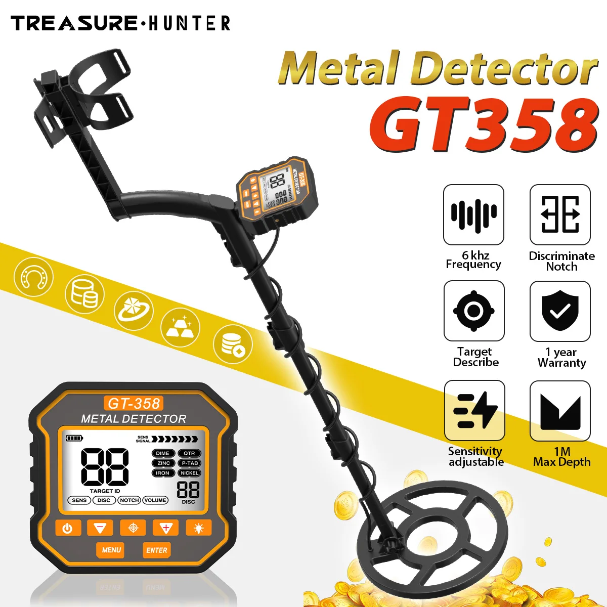 Treasure Hunter Metal Detector GT358 Underground Scanner Finder Digger Notch Waterproof 10" Coil Professional Pinpointing Tool