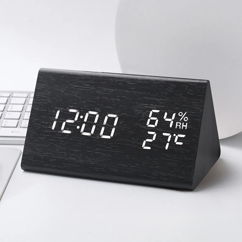 Triangular Wooden LED Alarm Clock Adjustable Brightness Humidity and Temperature Display Digital Alarm Clock Voice-activated