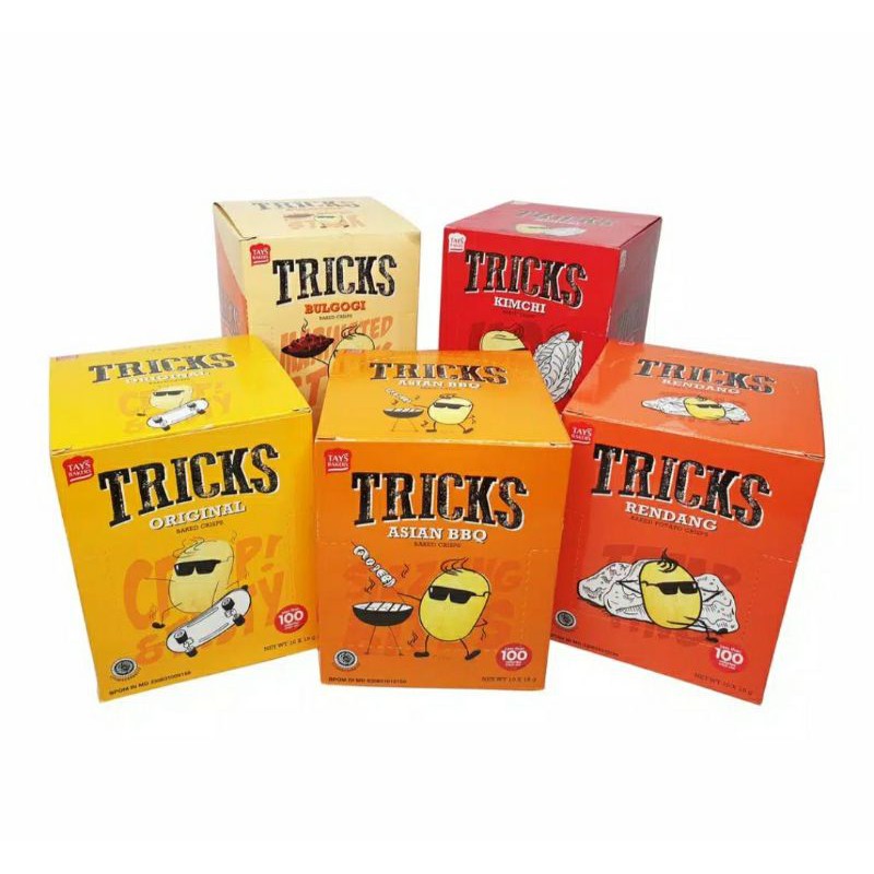 Tricks Crisps Biskuit Kentang Panggang, Snack kentang dengan varian rasa Asia yang khas membuat Tricks menjadi favorit semua kalangan. Dengan rasa Original, Asian BBQ, Kimchi serta Rendang pastinya bikin Anda ketagihan. Ukurannya yang pas dikantong cocok sekali untuk jadi cemilan.