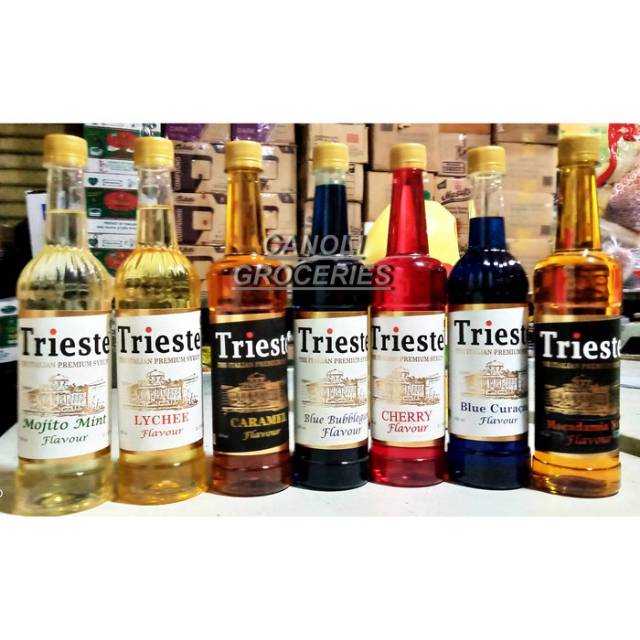 Trieste Syrup tersedia dalam 43 varian rasa: Hazelnut, Caramel, Vanilla, Tiramisu, Creme brulee, Macadamia Nut, Havana (sebelumnya bernama Jamaica Rum), Butterscotch, Roasted Almond, Java Brown Sugar, Coconut Cream, Lychee, Peach, Kiwi, Green Apple, Mango, Cherry, Passion Fruit, Pineapple, Wild Grape, Avocado, Lemon, Banana, Cantaloupe (Melon), Strawberry, Raspberry, Blueberry, Mixed Berry, Blue Curacao, Blue Bubblegum, Grenadine, Mojito Mint, Peppermint, Wild Mint, Taro, Matcha Green Tea, Chocolate, Lavender, Wild Rose, Osmanthus, Pandan, Red Velvet dan Roasted Hazelnut