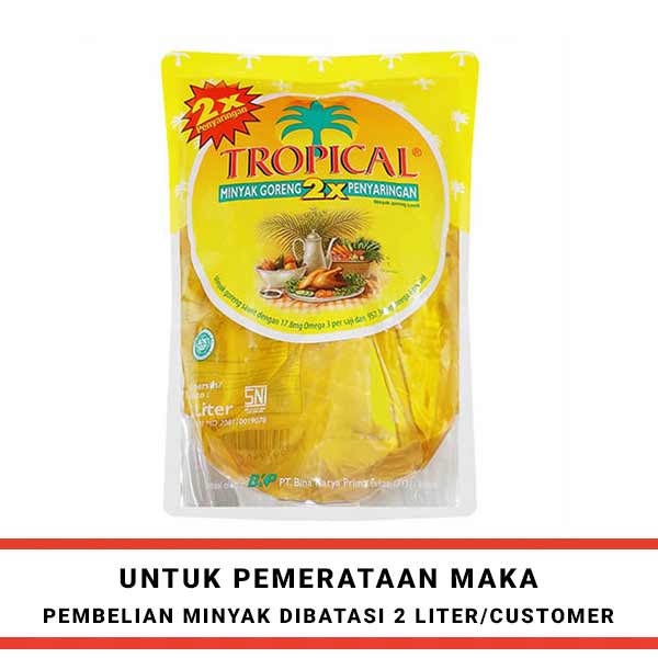 Minyak goreng Tropical terbuat dari kelapa sawit pilihan yang diproses dengan dua kali penyaringan sehingga menghasilkan asam lemak tak jenuh dan menjadikannya tetap jernih sampai 4x masa pemanasan lebih tahan panas dan tidak mudah tengik Minyak goreng Tropical mengandung asam lemak tak jenuh omega 9 paling tinggi yang mampu menurunkan kolesterol darah
