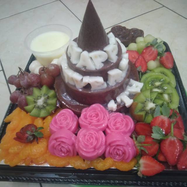 Pudding coklat berbentuk tumpeng pinggiran di hias buah buahan segar ( buah musim)
