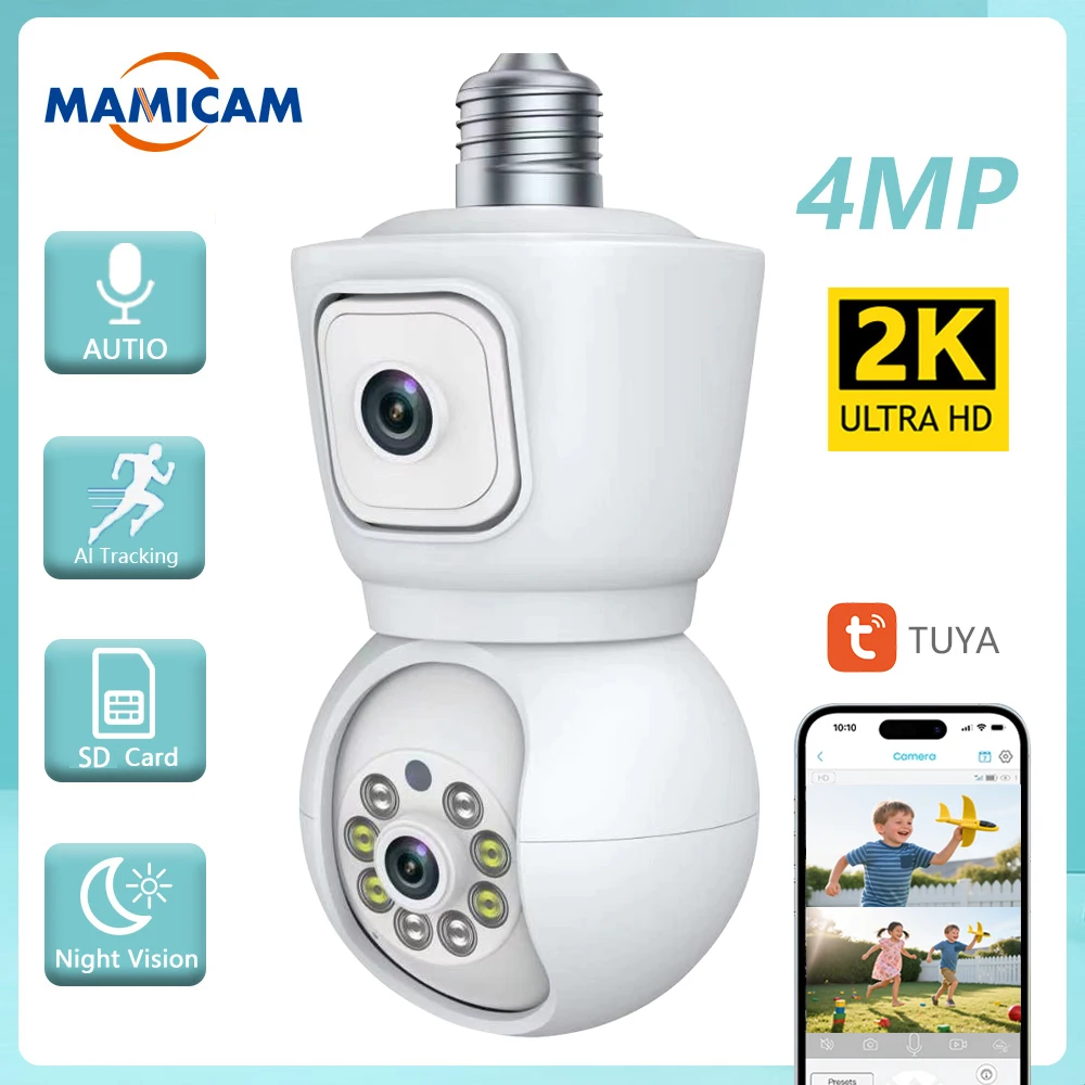 Tuya 2K 4MP HD PTZ WiFi Dual Lens Dual Screen Bulb Camera Tuya Smart Life Security Video Surveillance Camera Ai Human Auto Track