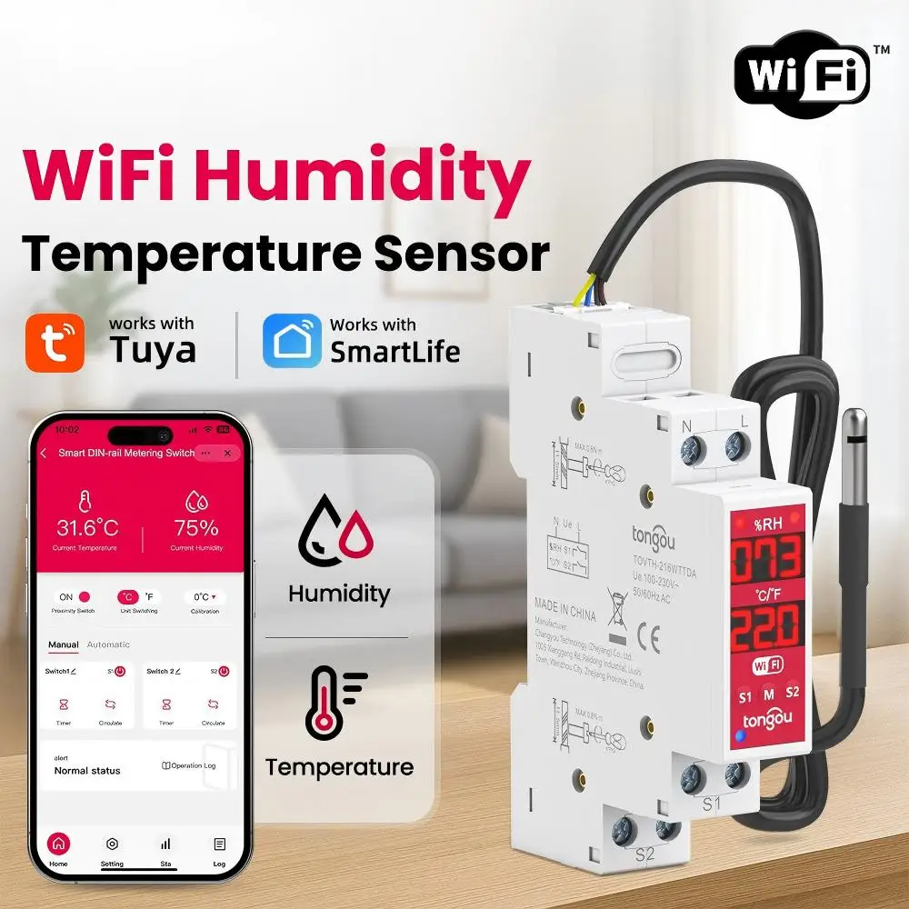Tuya Smart WiFi Switch Temperature and Humidity Sensor Din rail 18mm 2-Gang Timer Remote Control Monitoring Switch Smart Life