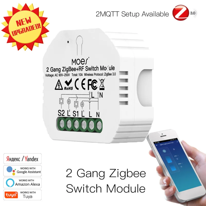 Tuya ZigBee 3.0 Smart Light Switch Relay Module 2 Gang Zigbee+RF Switch Module Smart Life App Control, Works With Alexa Google