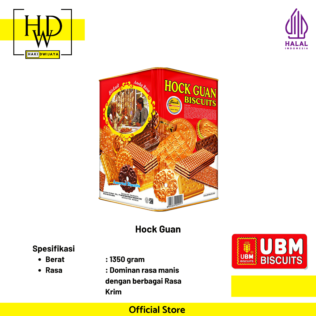 Hock Guan Assorted, dengan berbagi macam varian Rasa dan Bentuk, dengan kemasan menggunakan kemasan kaleng untuk isi yang lebih banyak, yang pastinya sudah teruji dan sudah bersertifikasi. Biskuit yang dibuat dengan bahan yang berkualitas dan diproses dengan mesin yang canggih.