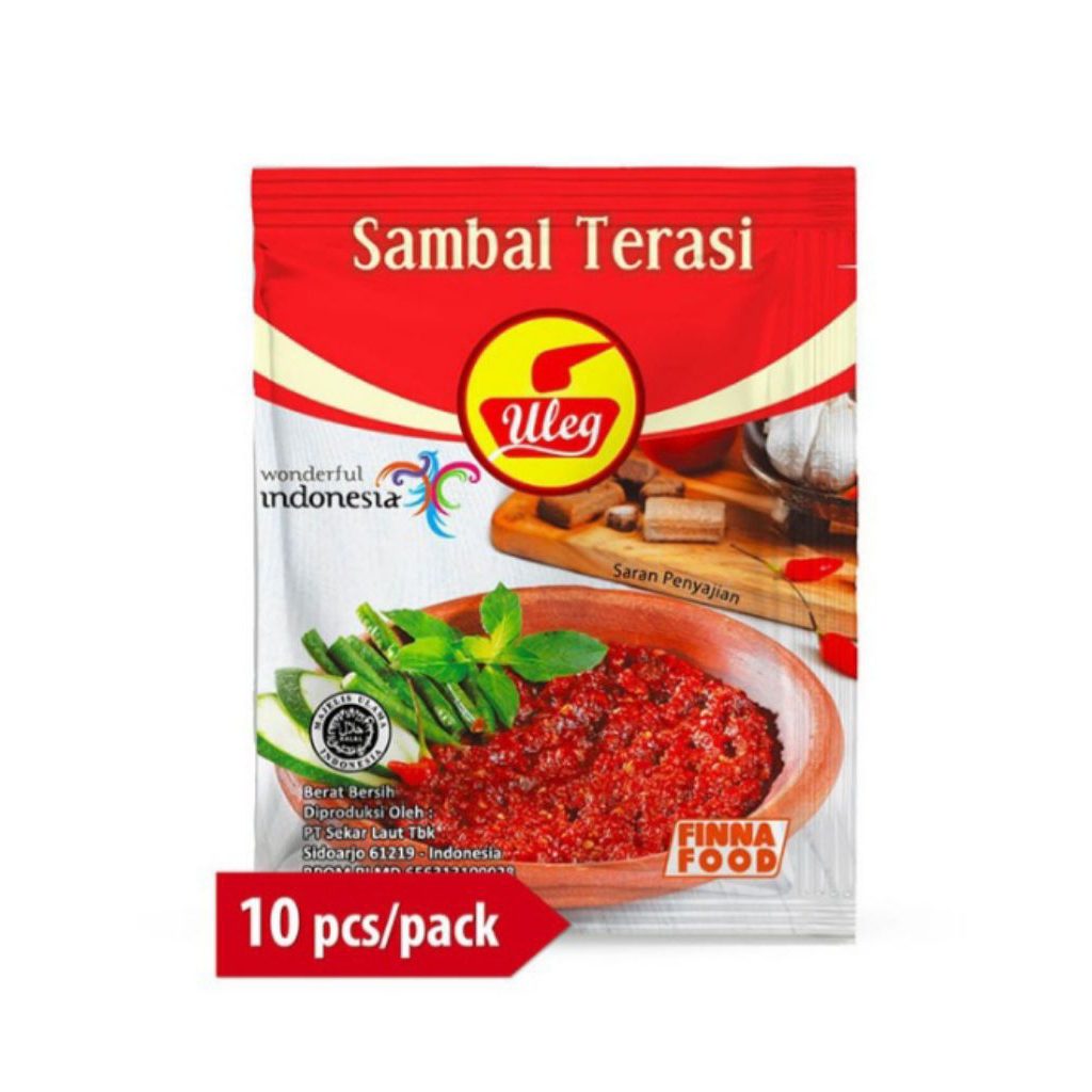 Uleg Sambal Terasi 10 x 18 g adalah sambal uleg terasi ala rumahan yang diolah dari cabe segar pilihan, dikombinasikan dengan terasi dan bumbu yang berkualitas untuk menjadikan hidangan bersama keluarga lebih nikmat. Dapat digunakan sebagai pendamping berbagai macam makanan seperti sambal untuk ayam goreng, bahan dasar balado, penyetan, bahan dasar nasi goreng, cah kangkung, bahan dasar masakan dan lain sebagainya. Tersedia dalam kemasan sachet pack isi 10 pcs.