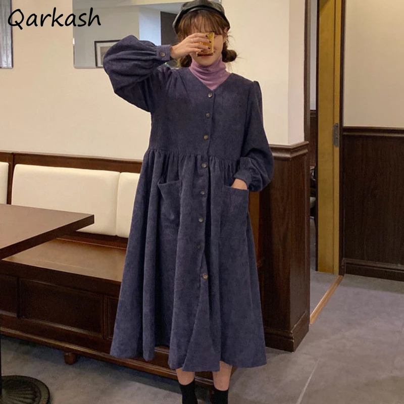 Solid Dress Women Corduroy Autumn New Retro Korean Style Long Sleeve Single Breasted All-match Students Fashion High Waist Loose