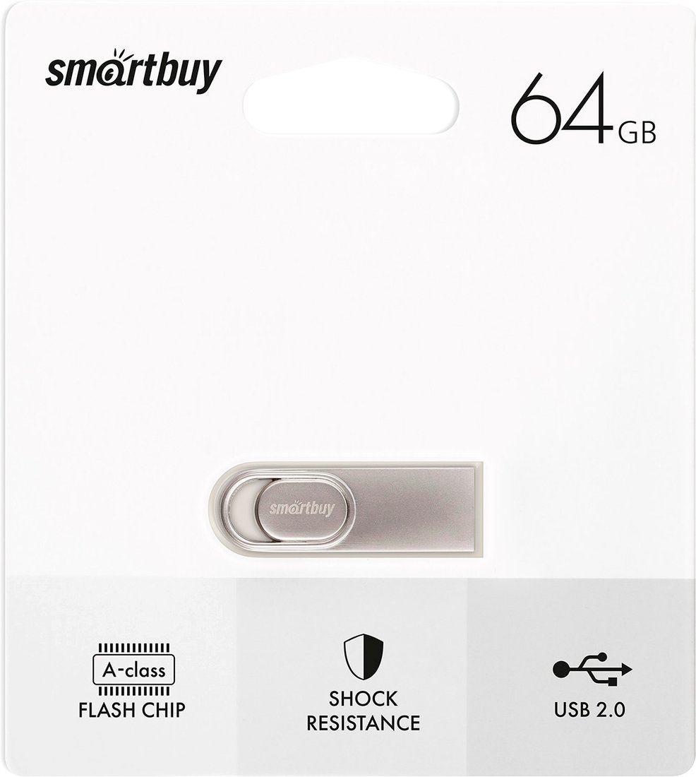 64 ГБ, USB 2.0 Type-A, выдвижной разъем, металл, цвет серебристый