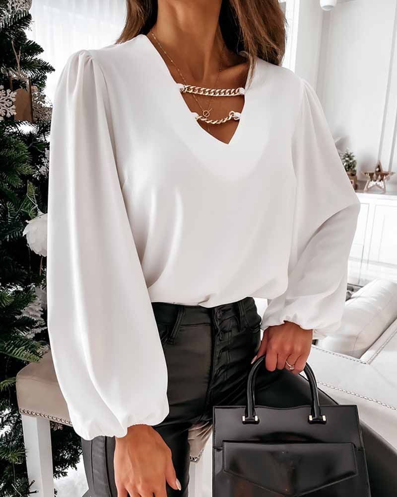 V Neck Lantern Sleeve Chain Decor Top, Black