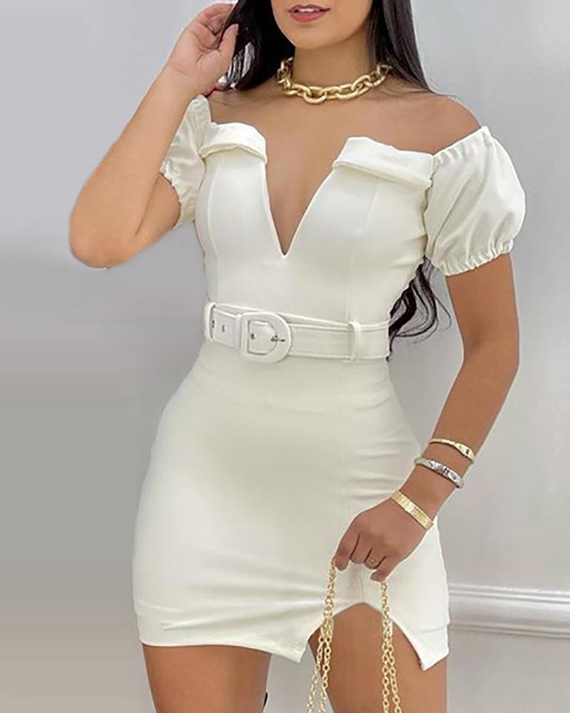 V Neck Puff Sleeve Slit Bodycon Dress, White