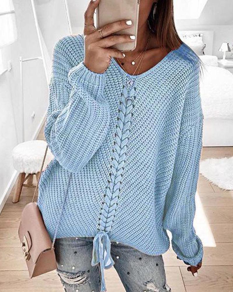 V Neck Rib Knit Sweater, Blue