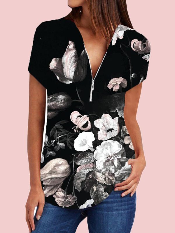 blouses,v neck zips print short sleeve blouse