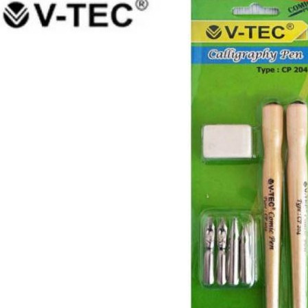 V-Tec Comic amp; Calligraphy Pen Tools Set (CP-204) V-Tec Calligraphy amp; Comic Pen Tools Set Pena celup dari V-tec untuk Anda yang hobi menggambar, lettering, dan lainnya. Set terdiri dari : 2x Pen holder terbuat dari kayu 1x Soft Eraser (12x18x27mm) 4x nib dip pen yang berbeda (tipe G-pen, School-pen, T2, T3) Ukuran: Pen holder (tanpa nib) : 12,5cm Nib : 3,5 cm Fungsi masing-masing Nib: - School Pen digunakan untuk membuat garis yang tipis. - G-Pen digunakan untuk membuat garis tipis hingga yang agak tebal. - T2 digunakan untuk mewarnai latar belakang karena menghasilkan garis yang tebal sekitar 2mm. - T3 sama seperti T2 namun sedikit lebih tipis digunakan untuk mewarnai latar belakang karena menghasilkan garis yang tebal sekitar 1,2 mm.
