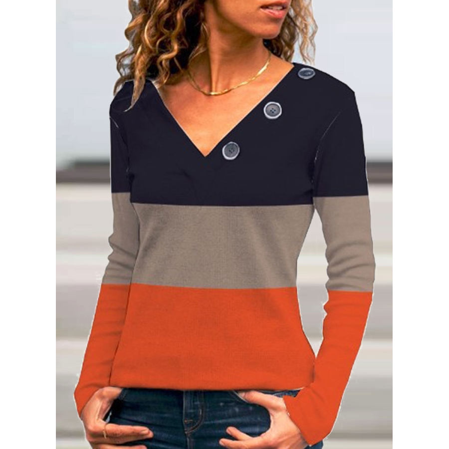 women tops,v-neck casual loose patchwork printed long sleeve t-shirt
