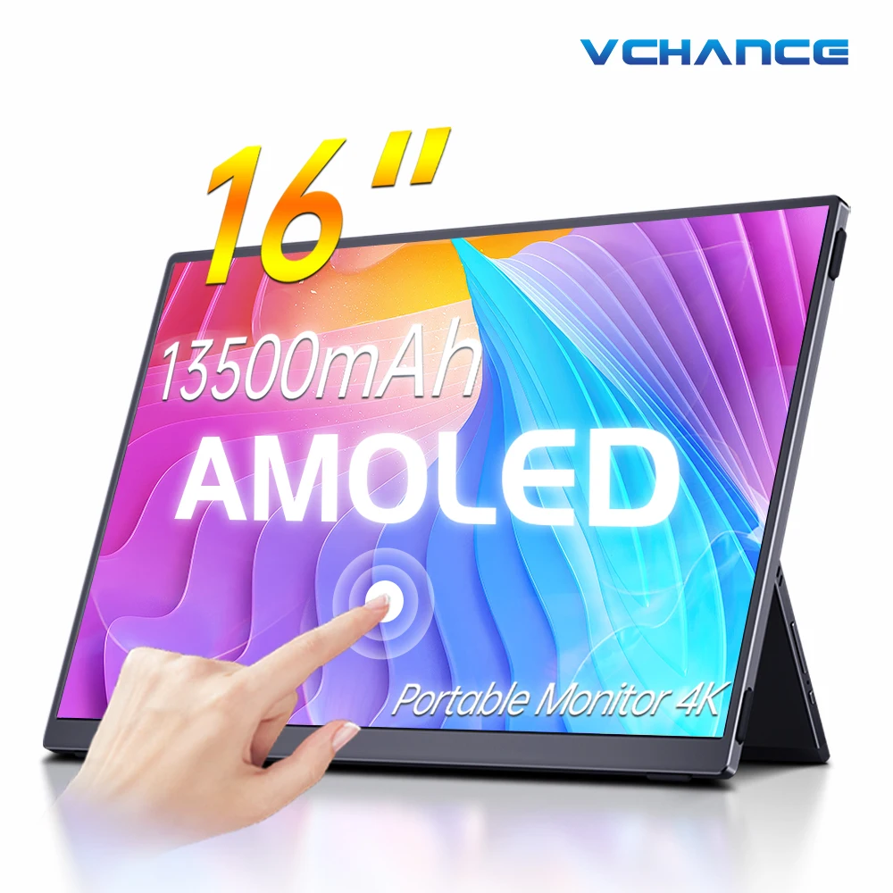 VCHANCE 16 Inch 4K OLED Portable Monitor Touchscreen with Battery 400nits Display Extender for Laptop PC macOS Phone With Bag