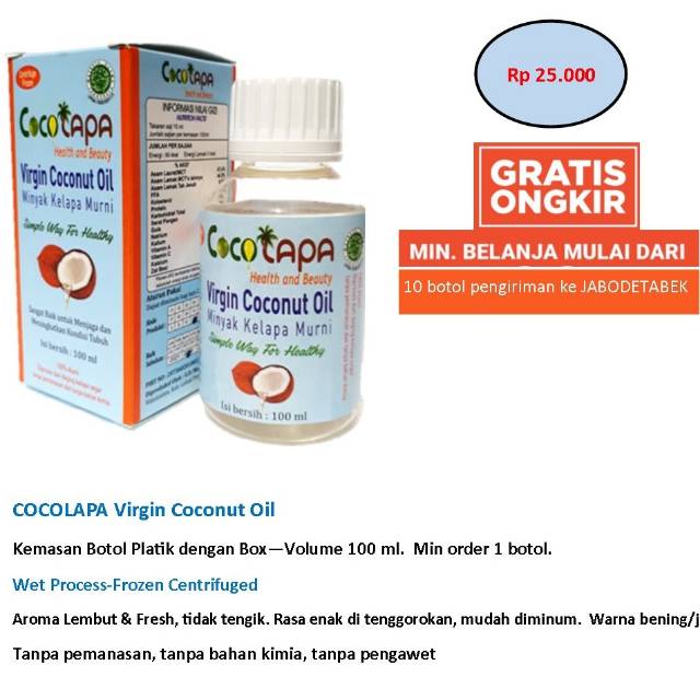 VCO COCOLAPA diproses dengan metode Ekstraksi Dingin (Frozen Centrifuge) tanpa pemanasan dan tanpa bahan kimia tambahan, menggunakan mesin2 modern sehingga kurang dari dua jam menghasilkan VCO yang Fresh, hygienis, aroma khas kelapa, tidak tengik, tidak gatal di tenggorokan. Memiliki Ijin PIRT dan Sertifikat Halal MUI.
