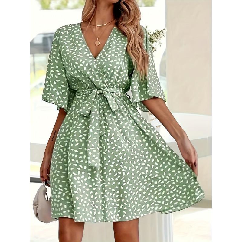 VEZFAA Женская мода Лето Весна Горошек Принт Короткие рукава V-образный вырез Высокая талия Повседневные платья XXL зелёный