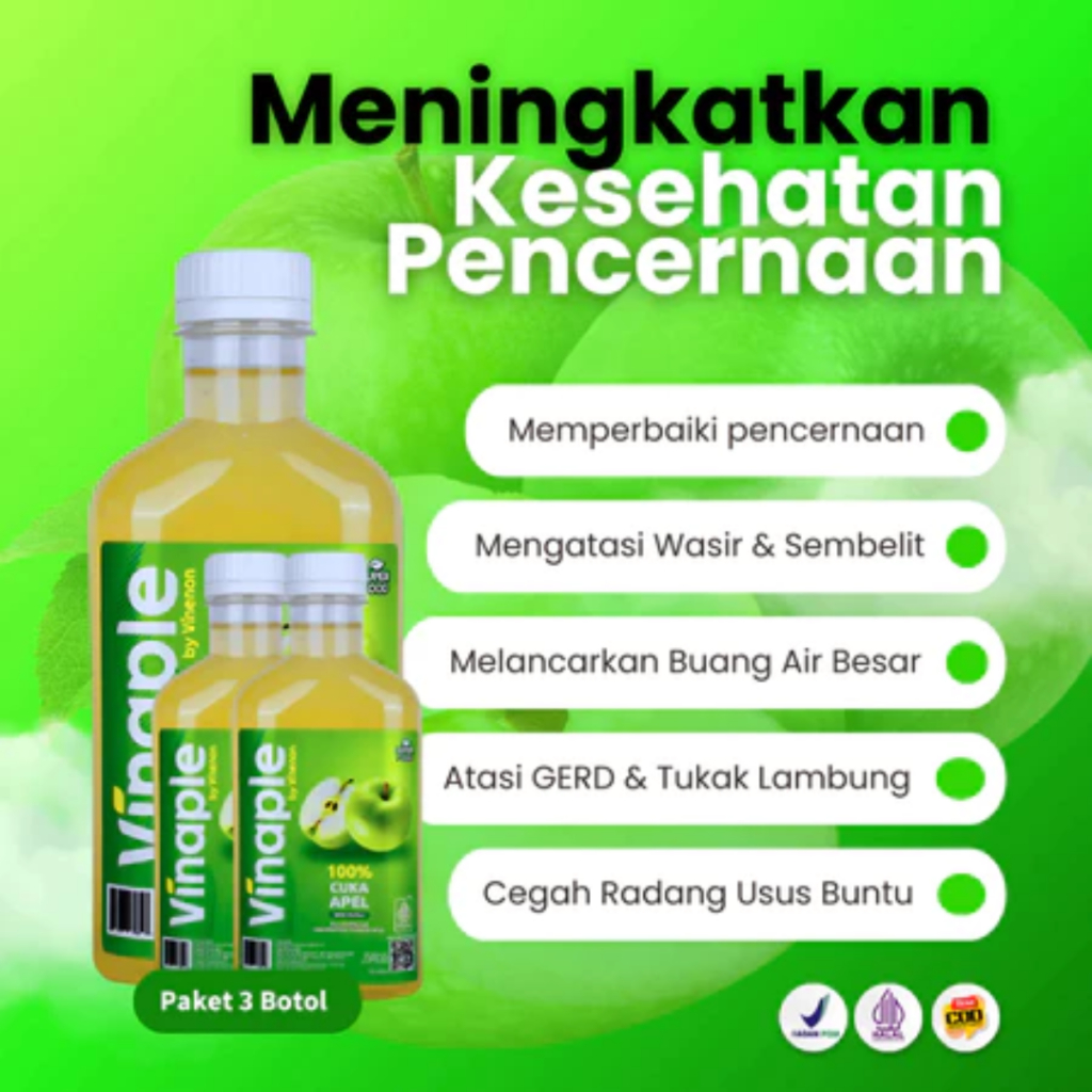 ✅Vinaple adalah cuka Apel organik yang dihasilkan dari proses fermentasi buah Apel Hijau pilihan selama 3 bulan menggunakan probiotik terbaik. 100% terbuat dari buah Apel ( ).