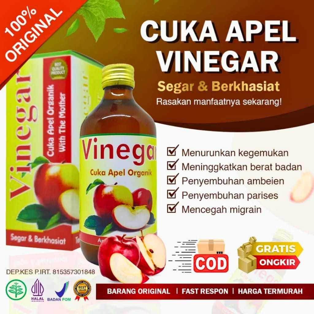 Khasiat terbesar dari cuka apel adalah kemampuannya mendetoksifikasi berbagai organ tubuh melalui aliran darah. Dia menghancurkan lemak dan endapan-endapan lain yang terdapat di dalam darah, sehingga melancarkan aliran darah di dalam tubuh. Kalium yang terkandung di dalamnya adalah unsur paling utama yang memberi khasiat pada cuka apel. Lancarnya aliran darah akan menjaga jantung anda tetap sehat dan tentunya mencegah anda menderita serangan jantung. Karena khasiatnya yang melancarkan peredaran darah, maka cuka apel baik digunakan untuk mengatasi keluhan arthritis, tekanan darah tinggi, kelelahan, sakit pada menstruasi, bahkan untuk mengurangi obesitas. Cuka apel yang alami akan berbentuk cairan yang agak kental, berwarna kecoklatan dan bila dilihat di bawah sinar akan tampak serat kecil-kecil yang disebut ibu. Semakin tua umur cuka tersebut, endapan ibu akan semakin tampak di dasar botol. Bila anda cium atau cicipi cuka apel ini rasa dan baunya akan terasa sangat menyengat, itu tandanya cuka tersebut alami. Cuka apel tak perlu disimpan di lemari es.