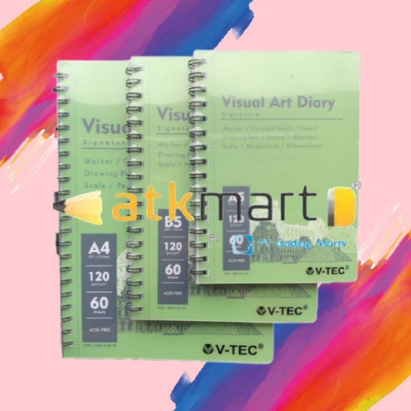 Buku V-TEC Visual Art Diary ini terdiri dari 60 halaman dengan ketebalan kertas 120gsm. Cocok untuk sketching kering.