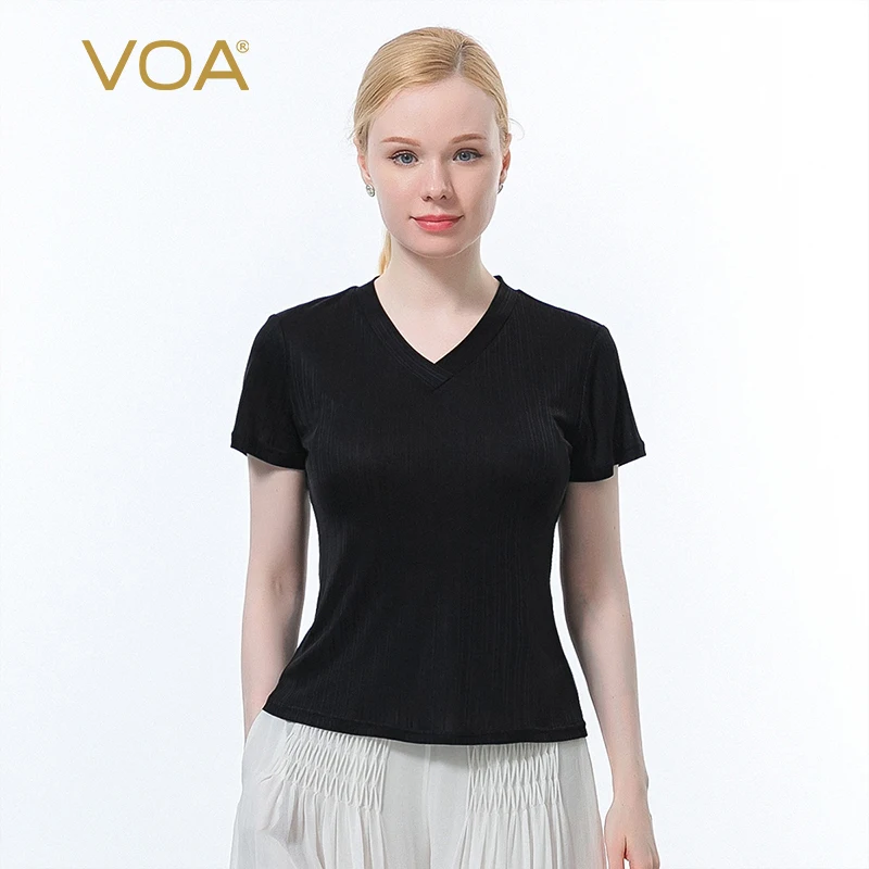 VOA, шелковая трикотажная нить, черная, круглый вырез, короткий рукав, для кожи, тонкая, модная, летняя, женская, повседневная, темпераментная ф...