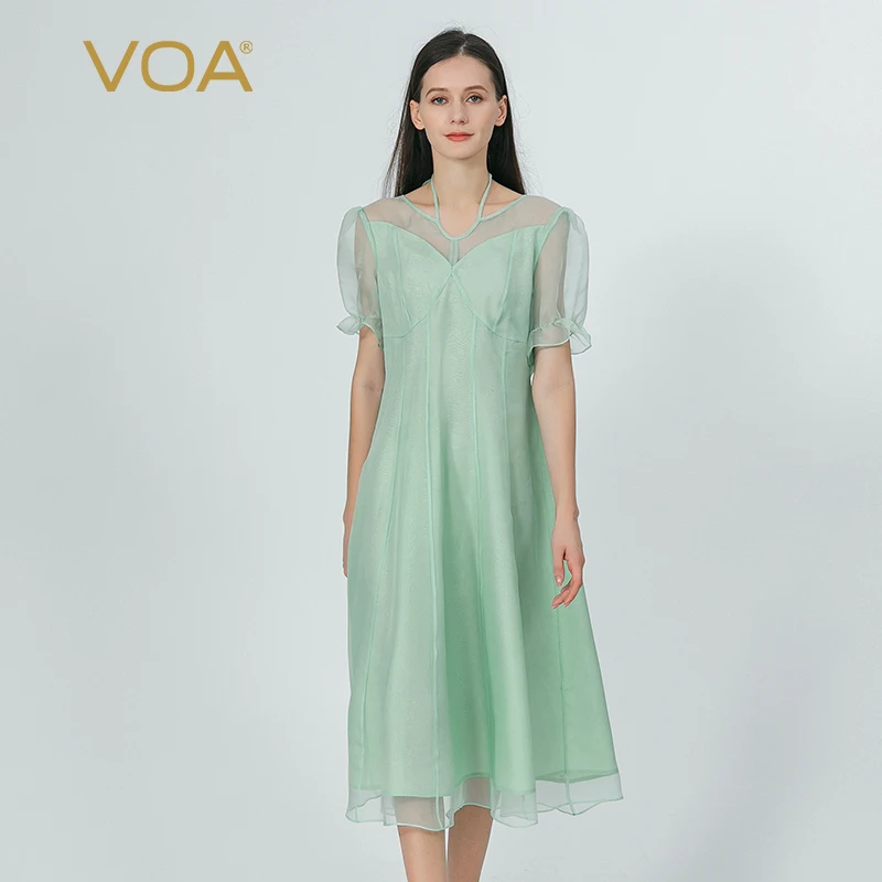 VOA, яркие, зеленые, 100% шелк, v-образный вырез, галстук, марля, милые пышные платья с короткими рукавами, легкое, жесткое шелковое платье Lolita ...