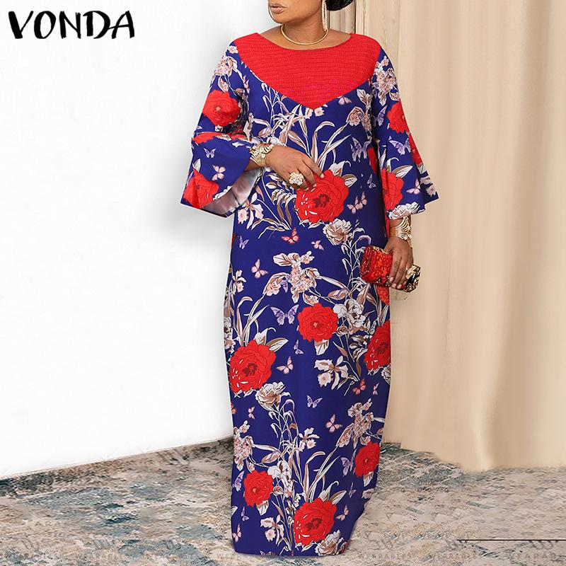 VONDA Весеннее женское длинное платье с расклешенными рукавами и цветочным принтом