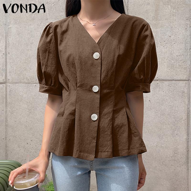 VONDA женская летняя свободная однотонная рубашка в рубчик с короткими рукавами и v-образным вырезом